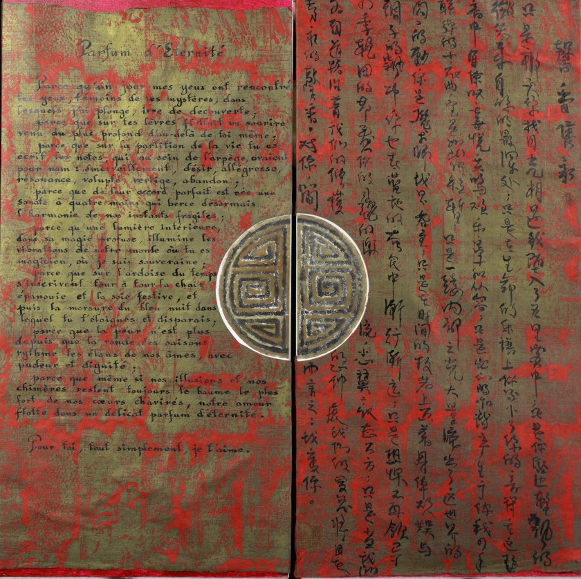 Texte écrit par mes soins dans le cadre du Printemps des poètes sur le thème » Lettera amorosa ». La traduction en chinois a été faite par HO Lui. Calligraphies latine et chinoise en style « cursive ». Dyptique format 50 x 50 cm