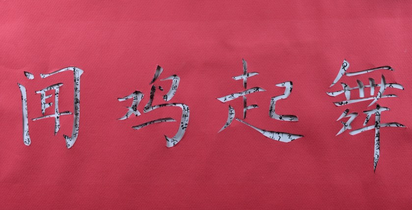 Calligraphie d’une sentence à quatre caractères sur le thème de la danse, en découpages sur un texte lui-même calligraphié. Format 18 x 45 cm