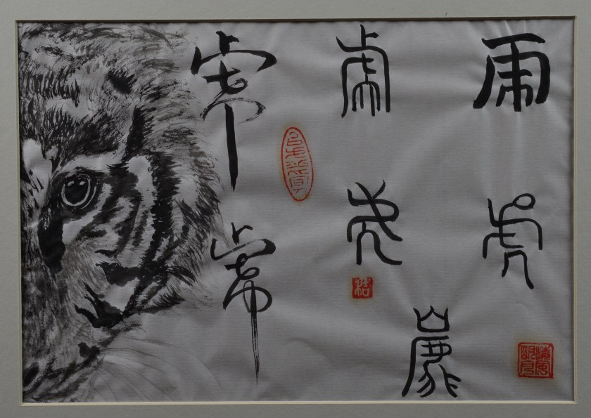 Calligraphie sur le thème du « Tigre ». Le mot est écrit dans les différents styles d’écriture. Format 20x 30 cm