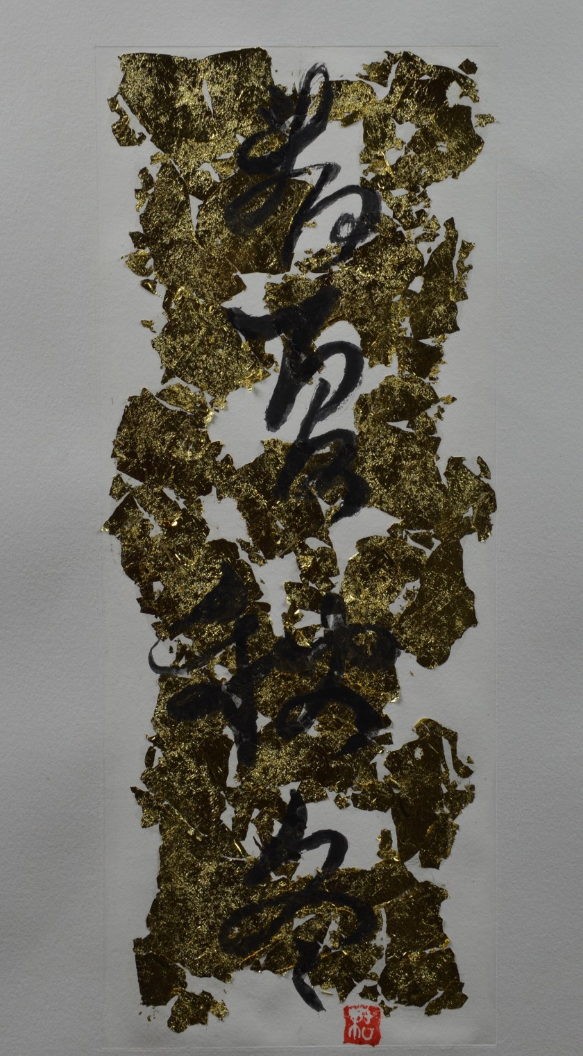 Calligraphie en écriture cursive des quatre saisons sur papier décoré de feuilles d’or. Format 30 x 40 cm